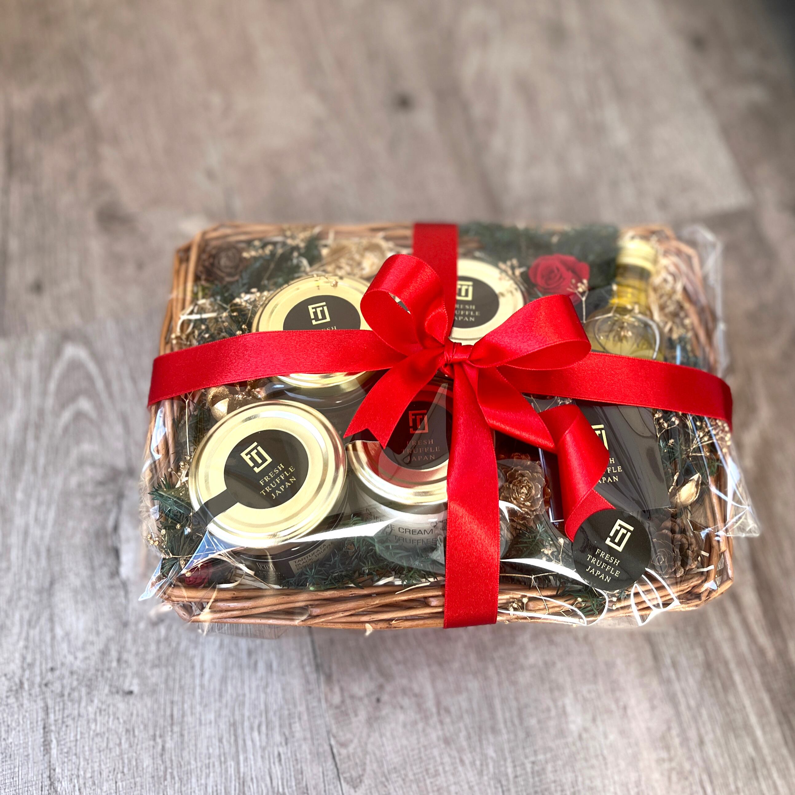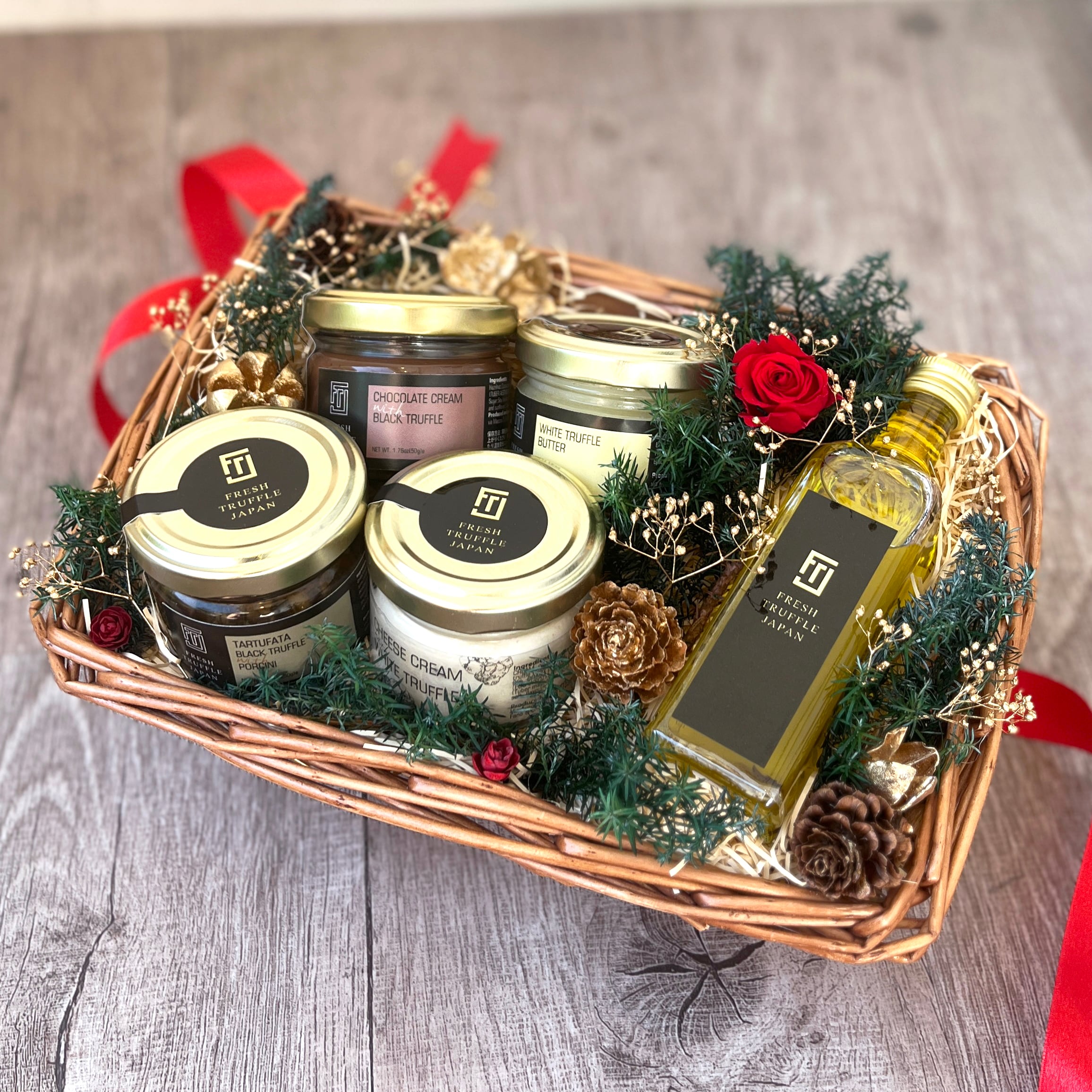 A 5-piece truffle set that can be enjoyed instantly—simply spread on bread or crackers. Adorned with a bright red preserved rose, it makes a festive and elegant Christmas gift.