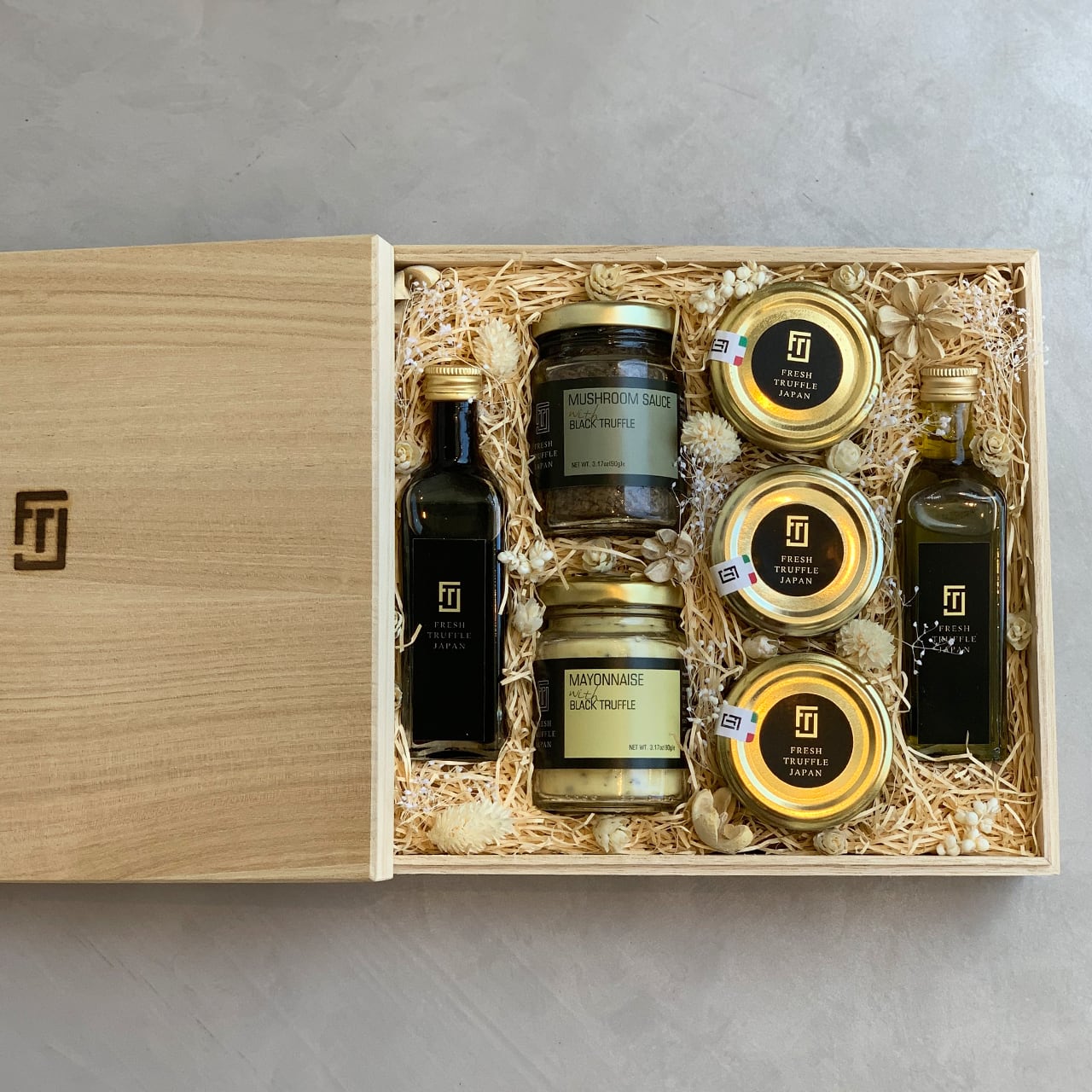 A seven-piece truffle seasoning set that offers an authentic taste has arrived in a wooden box. This set includes truffle oil, truffle soy sauce, and truffle salt, which expand your cooking options for pasta, risotto, meat dishes, and soups. Additionally, it features black truffle mayonnaise, which allows you to easily enjoy truffles by simply spreading it on crackers, bread, or vegetables, as well as a truffle and porcini dip sauce. For dessert, you can savor truffles with truffle chocolate cream and truffle honey, providing a delightful variety of seven different items.