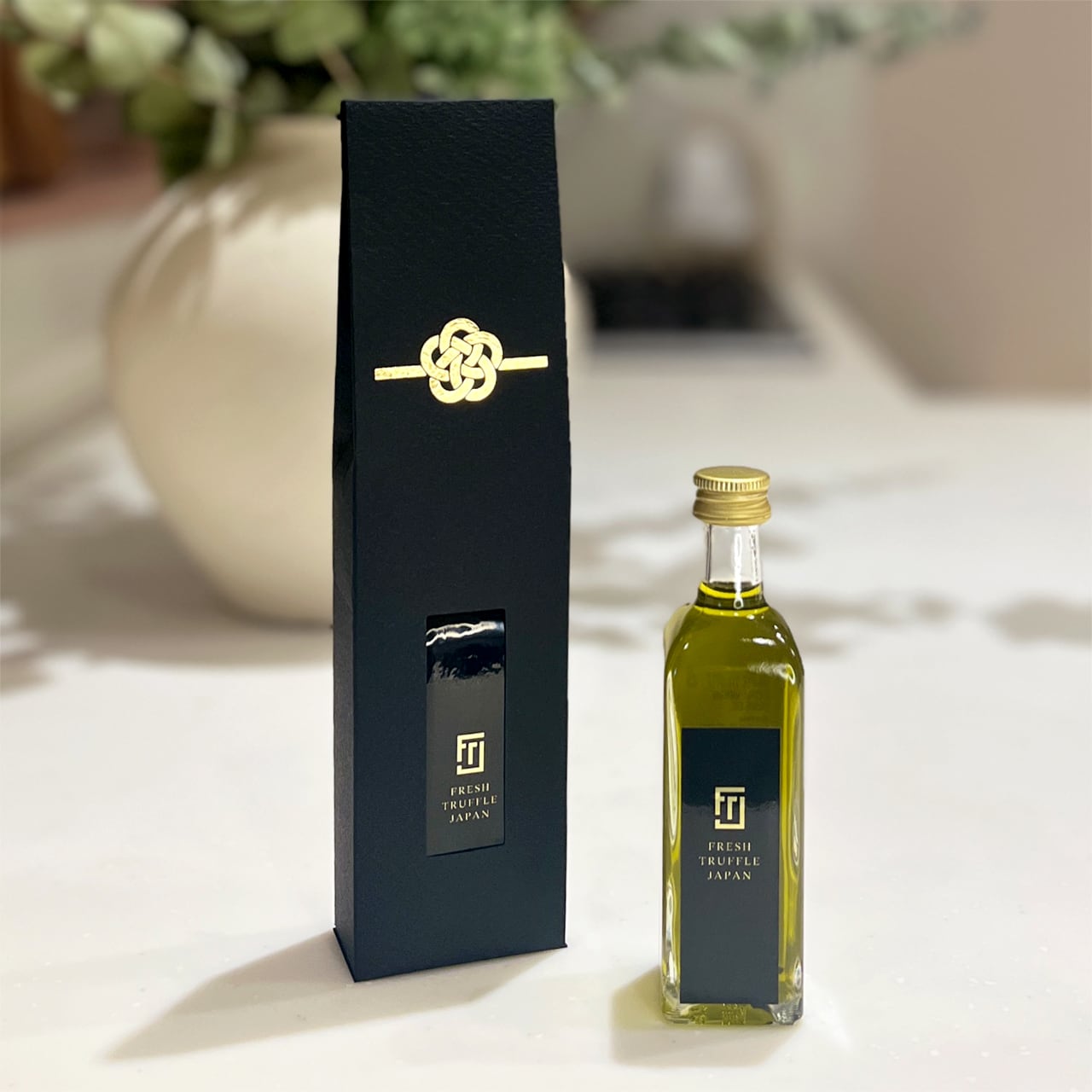 FRESH TRUFFLE JAPANの人気シーズニング、白トリュフオイルを1本からギフトとして贈りたいというリクエストにお応えし、梅結びの金箔が施された贈答用パッケージは、ジャパニーズモダンをコンセプトにデザイン。